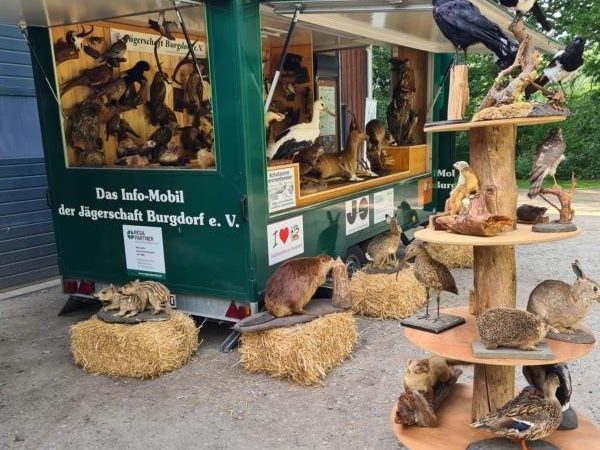 Mit dabei, das Infomobil der Jägerschaft Burgdorf und ein Team von Jägern, die Fragen gerne beantworteten. Die meisten der bei uns vorkommenden Wildtiere können hier bestaunt und auch angefasst werden. Zum Beispiel das „Kleine Mauswiesel“ als kleinster Vertreter des bei uns vorkommenden Raubwildes. Von Marderhund und Nutria hatten einige Teilnehmer noch nichts gehört. Hier gabs viel Hintergrundwissen, auch zu den letztgenannten eingewanderten Neozoen und warum sie bejagt werden. Raubvögel aus nächster Nähe. Wie kann man Habicht und Sperber unterscheiden? Fragt die Ferienkinder, die wissen das jetzt. Vom kleinsten Falken (Merlin) bis zum größten in Deutschland vorkommenden Wanderfalken präsentiert das Infomobil heimisches Wild im Fell oder Federkleid. Gehörne, Geweihe sowie Decken und Schwarten konnten untersucht und erkannt werden.