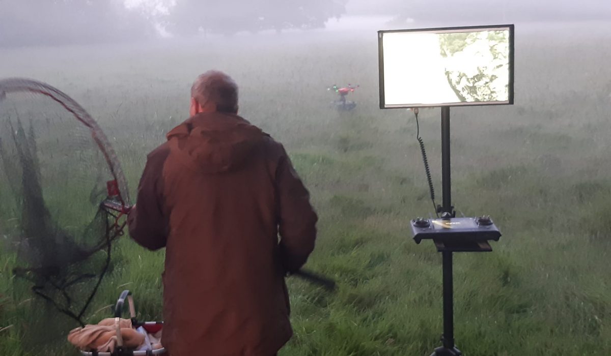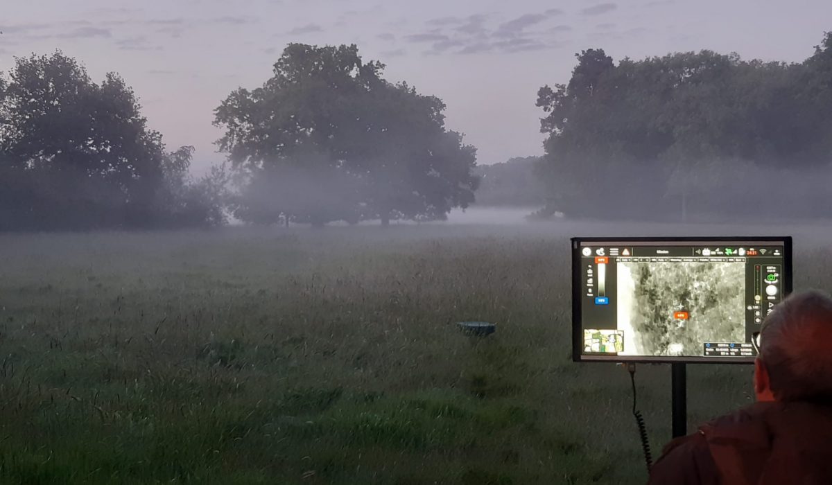 - Heute: Der Monitor im Morgengrauen auf der Wiese direkt vor der Mahd zeigt das abzufliegende Gebiet, die Wärmebildkamera der Drohne zeigt alles, was wärmer ist als die Umgebung. Dieser Kontrast ist in den frühen Morgenstunden am deutlichsten zu sehen, bevor die Sonne das Feld erwärmt.