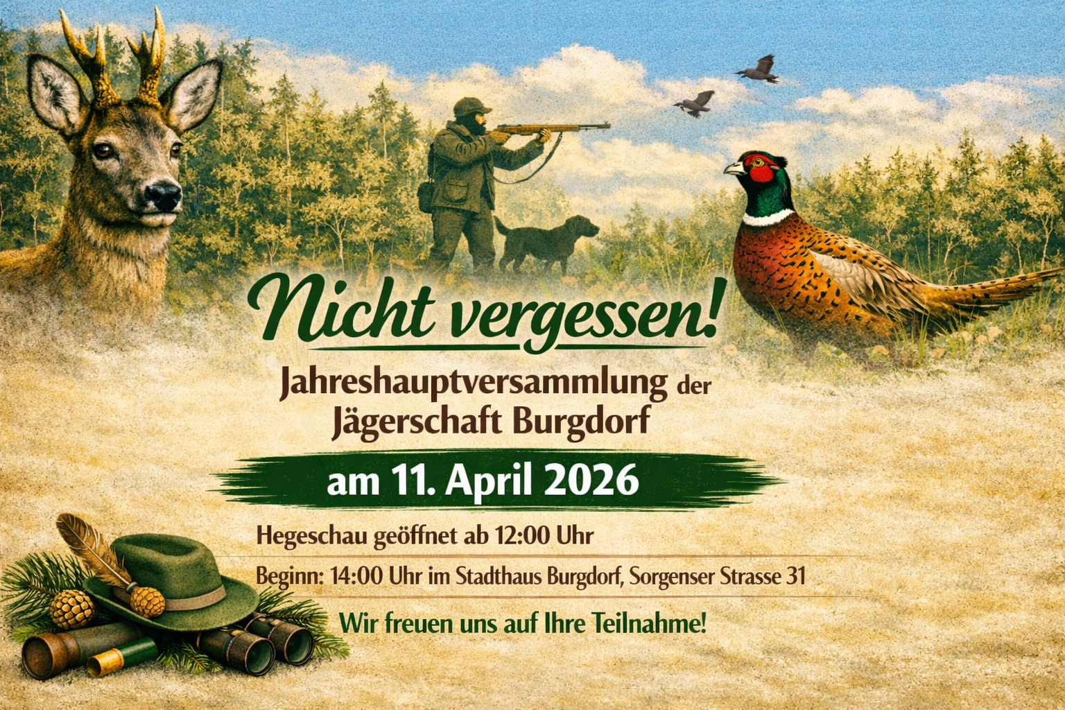 Die Jahreshauptversammlung der Jägerschaft Burgdorf mit Hegeschau findet am 11.April 2026 statt.