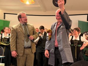 Für den scheidenden Hartmut Scholz war zum Abschluss eine Überraschung vorbereitet worden. Da er sich bereit erklärt hatte, die Hausmeistertätigkeiten im neuen „Freientreff“ zu übernehmen, erhielt er einen grauen Hausmeisterkittel, einen passenden Cordhut und einen Plüschdackel, der optisch perfekt mit Scholz‘ rotkariertem Hemd harmonierte. Auf Initiative von Ralph Köhler wählten die Mitglieder Hartmut Scholz abschließend zum Ehrenhegeringleiter.